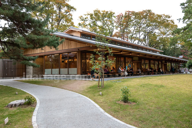 苑内にある「中立売(なかだちうり)休憩所」。ガラス張りの店内から緑を眺めながら、和菓子やお茶を楽しめます。