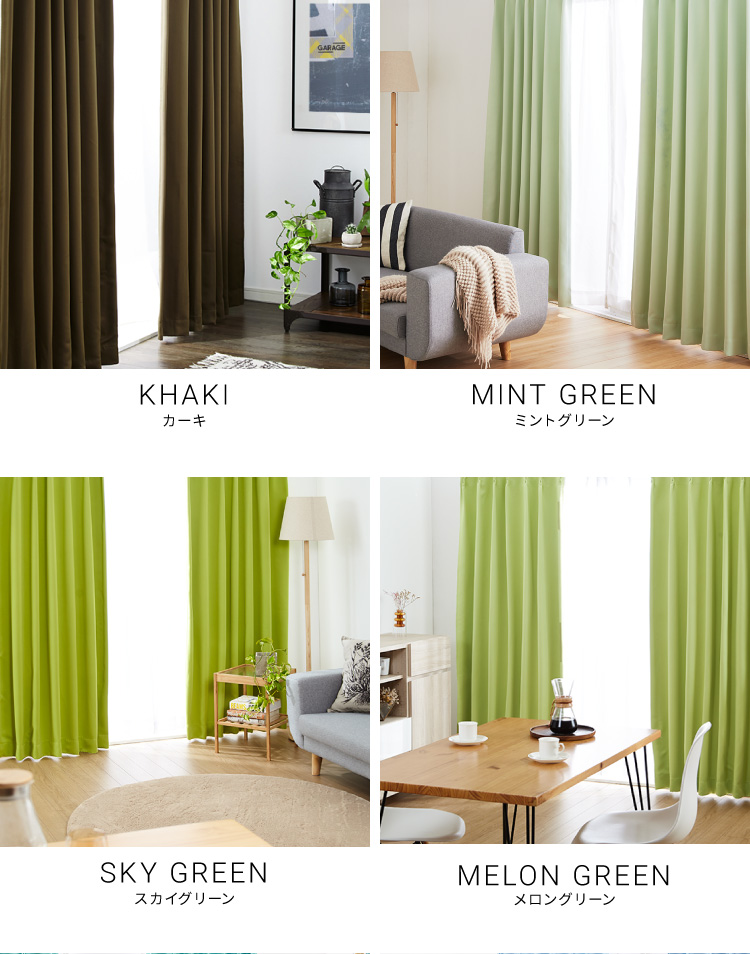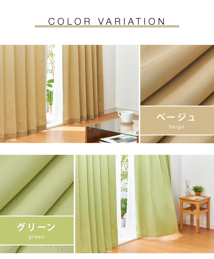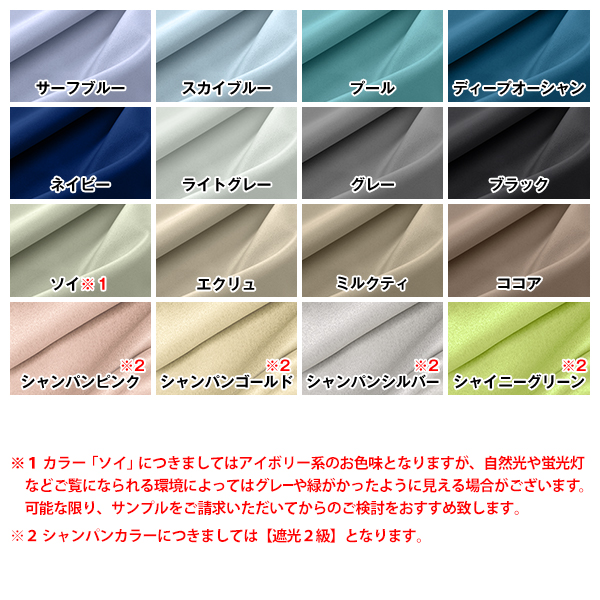 ・アイボリーとブルー、ライトベージュは遮光2級(裏地は表地をできるだけ暗くしないように明るいグレーを使用。) グリーンとピンクは遮光2級(裏地にはブラウンの生地を使用)となります。
