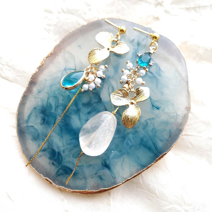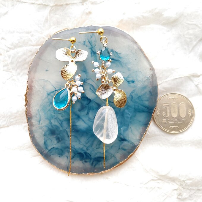 - 大粒天然石とブルーのアシメントリーピアス